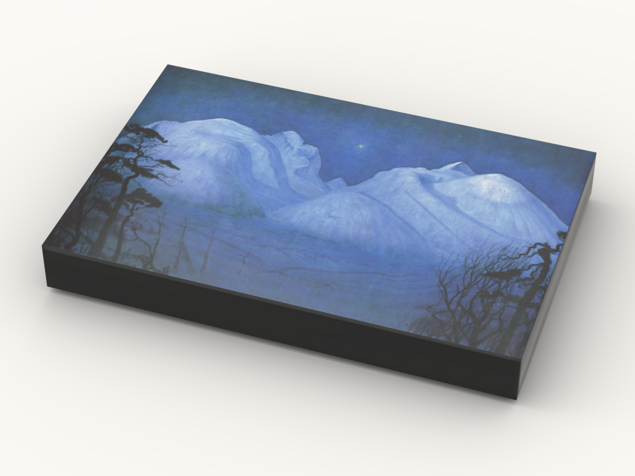 “Vinternatt i Rondane” by Harald Sohlberg (1914), UV-printed on a genuine black Lego® 2×3 flat tile. A miniature reproduction of one of Norway’s most beloved artworks.